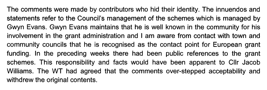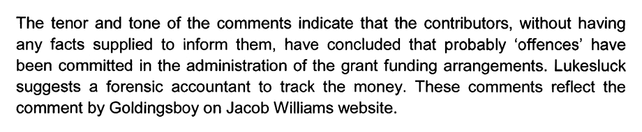 Mr. Harding accepted that Mr. Evans was wrong about the content he found so ‘scandalous’ saying that it “does not relate to the grant schemes” and that he would “ignore it in considering the complaint.”