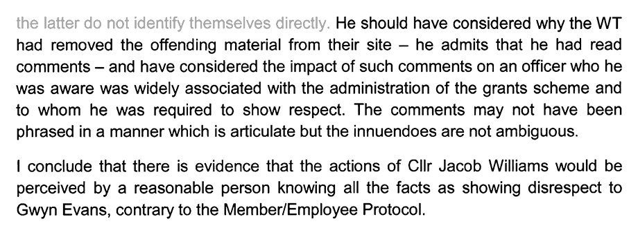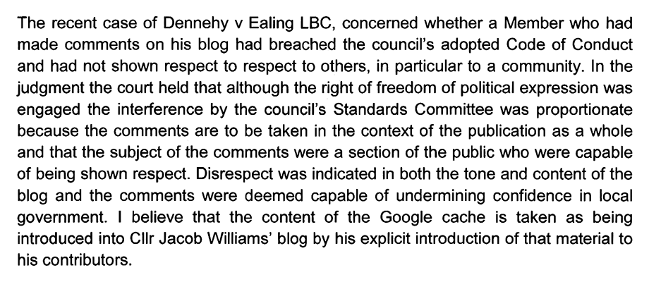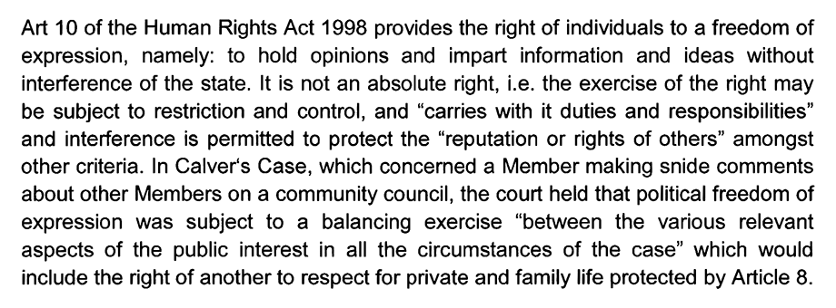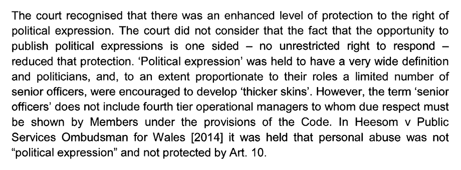 Mr. Harding further padded his report with various appendices including “Guidance on use of social media by Members issued by the WLGA” [Welsh Local Government Association] as well as “The Human Rights Act 1998 Schedule 1; Article 10,” and references to some councillor in the London borough of Ealing.