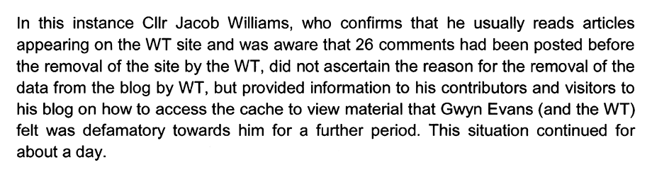From the word go I explained to Mr. Harding that Mr. Evans misread or misinterpreted the Western Telegraph’s comments section which was the basis of his complaint against me, for providing a link to the Google cache of the page where the comments were still visible.