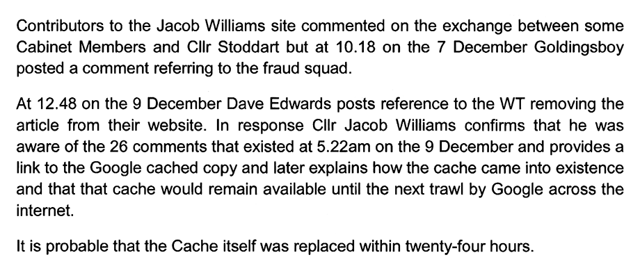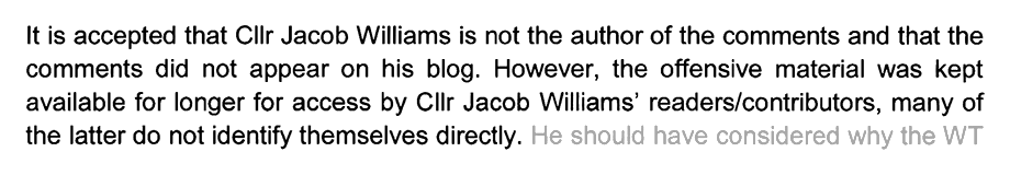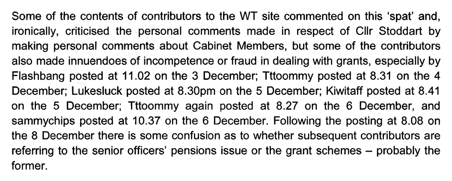 In fact they were not all removed, like Mr. Harding says. The comments section was temporarily taken down, presumably when the WT were considering Mr. Evans’ complaint, but reinstated soon after, when it became apparent only three comments got the chop, none of which related in any way to Mr. Evans like he believed. (These are the comments I showed in red in my email to the monitoring officer, in part one.)