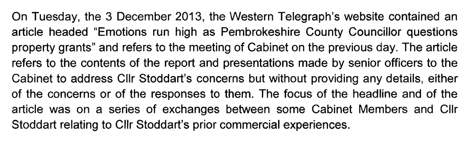 For some bizarre reason, as evidenced in part one, Mr. Harding got all hot under the collar about the Western Telegraph’s report of the December 2013 cabinet meeting failing to quote from the flawed whitewashing report drafted by the council officers denying Cllr. Mike Stoddart’s claims of irregularities.