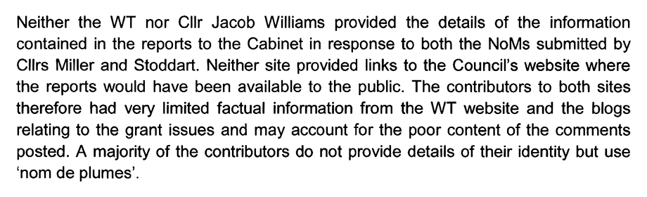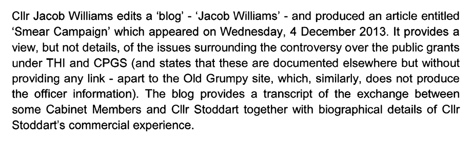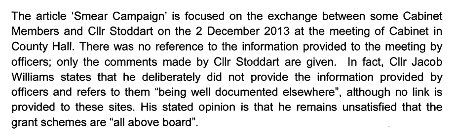 A year earlier, when the monitoring officer concluded in a hopelessly flawed whitewashing report to the audit committee that everything in the authority’s grant scheme administration was kosher, he did so despite the mounting evidence collated by Cllr. Stoddart.
