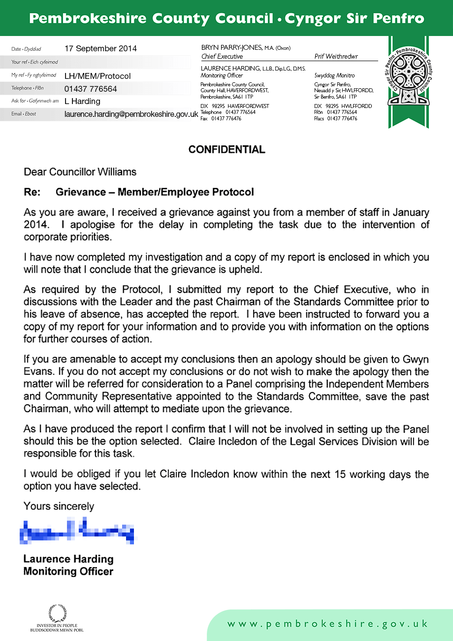 Here’s the covering letter accompanying Mr. Harding’s ‘grievance report’ into Mr. Evans’ allegation: