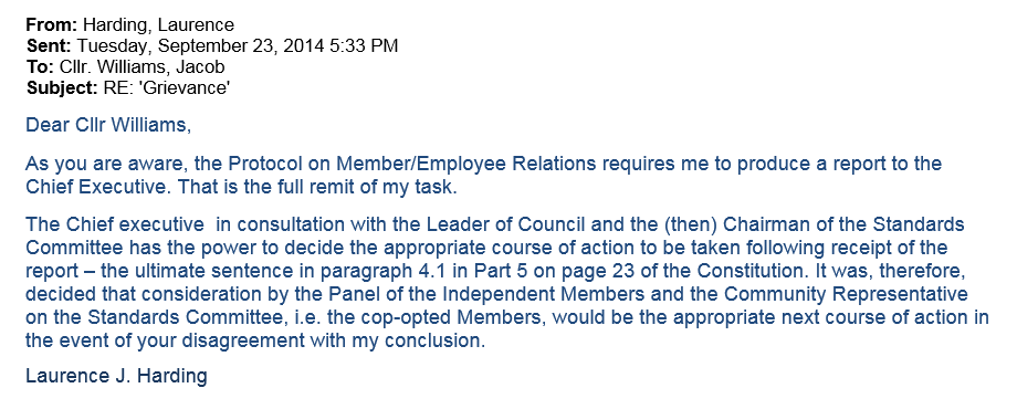 As Mr. Evans’ baseless allegation had been determinedly treated by Mr. Harding in-house under the Mickey Mouse ‘informal’ ‘grievance’ protocol, there was absolutely no role to be played by the standards committee or ‘panels’ of its members.