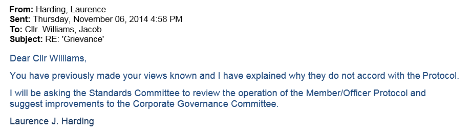 But Mr. Harding’s mealy-mouthed words on how the chief executive should “have regard” to Cllr. Adams’ views confirmed he had no good explanation for such sloppy conduct – and I knew I had them on the ropes.