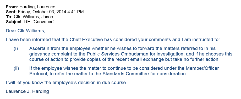 But it’s a wonder he bothered to make up these answers at all, considering in the same email he was about to confirm my anticipation that Gwyn Evans had decided to pull out of this groundless procedure and refer “the matters within his grievance and others to the Public Services Ombudsman for Wales.”